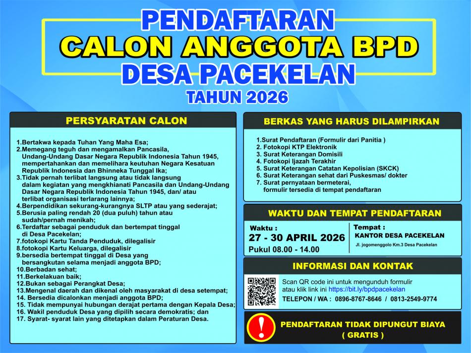 Berdasarkan hasil rapat Panitia Pengisian Keanggotaan Badan Permusyawaratan Desa (BPD) Desa Pacekelan, Kecamatan Purworejo, yang dilaksanakan pada tanggal 10 April 2026, telah disusun beberapa hal penting sebagai dasar pelaksanaan kegiatan. Di antaranya adalah tata tertib pengisian keanggotaan BPD, penyusunan Rencana Anggaran Biaya (RAB), serta jadwal tahapan kegiatan.