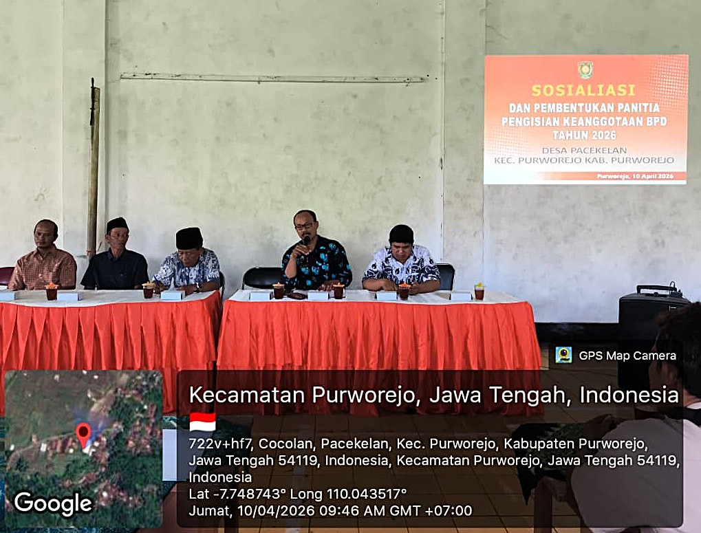 Pemerintah Desa Pacekelan melaksanakan kegiatan Sosialisasi dan Pembentukan Panitia Pengisian Keanggotaan Badan Permusyawaratan Desa (BPD) Tahun 2026 pada Jumat, 10 April 2026, bertempat di Gedung Olah Raga Desa Pacekelan. Kegiatan ini dimulai pukul 08.30 WIB hingga 10.45 WIB dan dihadiri oleh berbagai unsur masyarakat serta pemangku kepentingan desa.